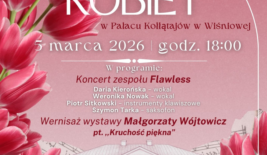 Burmistrz Miasta i Gminy Staszów oraz Staszowski Ośrodek Kultury zapraszają na wyjątkowe obchody Dnia Kobiet, które odbędą się 5 marca 2026 roku o godz. 18:00 w Pałacu Kołłątajów w Wiśniowej.