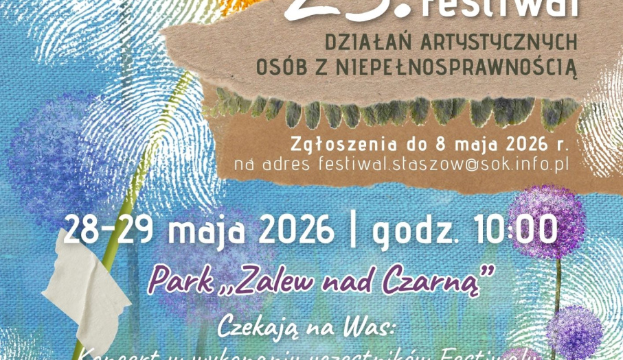 Sztuka ma niezwykłą moc – potrafi łączyć, inspirować i budować przestrzeń do wspólnego działania. W dniach 28–29 maja 2026 r. o godz. 10:00 w Parku „Zalew nad Czarną” odbędzie się 23. edycja Festiwalu Działań Artystycznych Osób z Niepełnosprawnością, podczas której zaplanowano m.in. koncert uczestników oraz prezentację prac plastycznych.