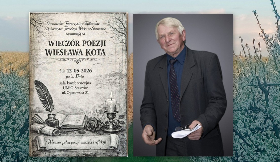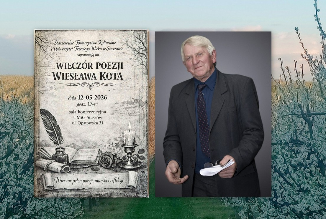 12 maja 2026 roku o godz. 17:00 w sali konferencyjnej UMiG w Staszowie odbędzie się „Wieczór Poezji Wiesława Kota”. Podczas spotkania będzie można bliżej poznać twórczość autora, wysłuchać opowieści o jego życiu oraz inspiracjach towarzyszących powstawaniu wierszy.